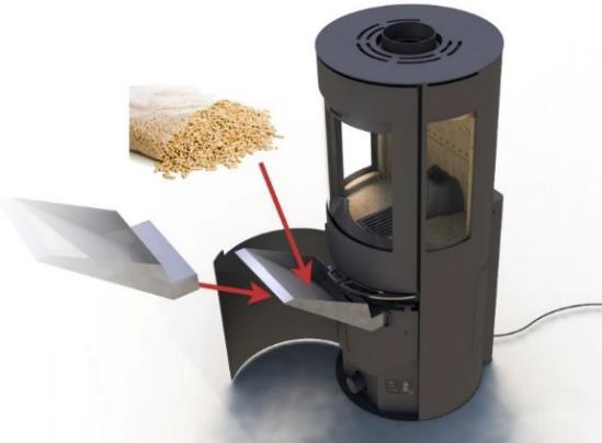 - Im Betrieb können Pellets nachgefüllt werden, um die Brenndauer zu verlängern.
